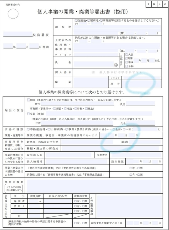 個人で事業を始めたときは、その1カ月以内に「個人事業の開業・廃業等届出書」を納税地を所轄する税務署に提出します。