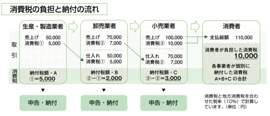 税金分は事業者が販売する商品やサービスの価格に含まれて、次々と転嫁され、最終的に商品を消費し又はサービスの提供を受ける消費者が負担することとなります。