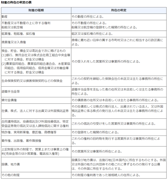 下の表中の財産の種類ごとに財産の判定の欄にある場所が、国内にある場合は国内財産、国内にない場合は国外財産になります。